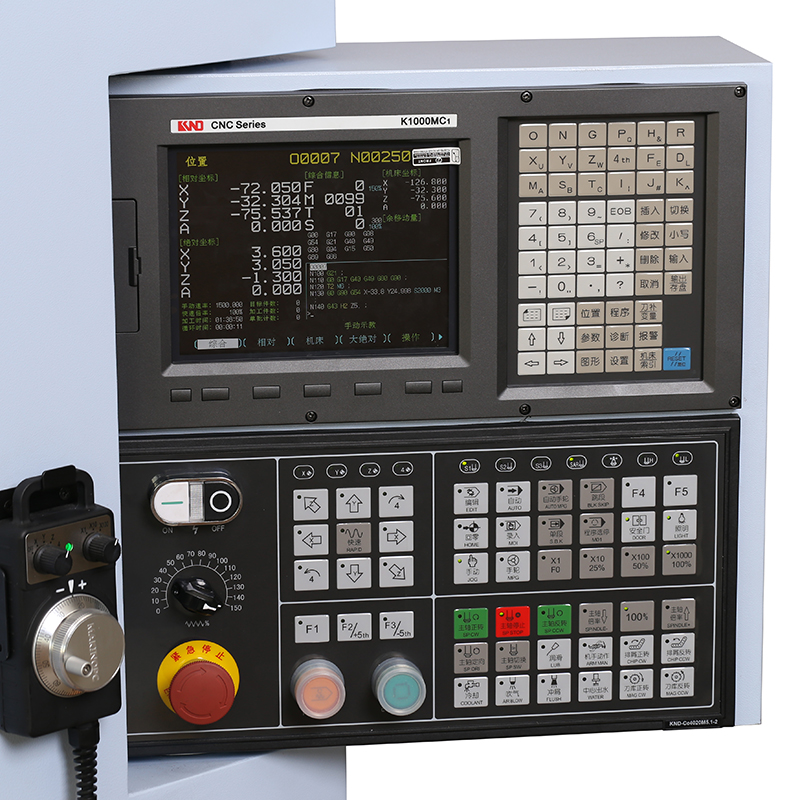 3) 功能加大,四轴联动,配置凯恩帝KND1000MC1工业级数控系统,适用国际通用程序,故障自动检测报警功能、断电记忆功能。
